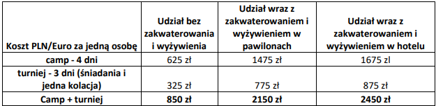 Poniżej cennik udziału w poszczególnych wydarzeniach. Zestawienie obejmuje trzy podstawowe możliwości udziału – sam udział bez zakwaterowania i wyżywienia, udział wraz z zakwaterowaniem i wyżywieniem w standardzie hotelowym oraz udział wraz z zakwaterowaniem i wyżywieniem w standardzie budżetowym.